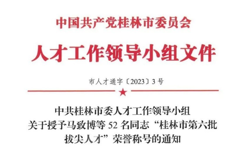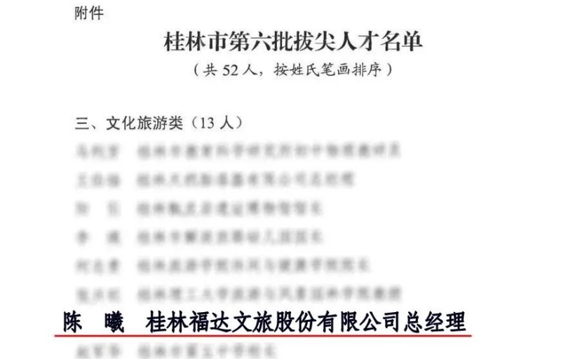 近日,中共桂林市委人才工作领导小组发布了《关于授予马致博等52名同志“桂林市第六批拔尖人才”荣誉称号的通知》,经组织推荐、专家评审、考察考核、社会公示等程序,桂林福达文旅股份有限公司总经理陈曦被授予“桂林市第六批拔尖人才”荣誉称号。